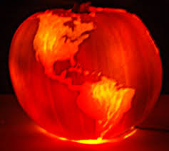 Well, it's official---I love Halloween! All the costumes, spookiness, pumpkins, colorful leaves, and of course, candy!! But I have realized this week that there is one thing I do not like about Halloween....the pumpkin carving contest at my work. It's not that I dislike carving pumpkins at work--it's actually really fun to walk through the library with my hands covered in pumpkin goop---it's that I do not like group projects. You see, every year, the library hosts a library-wide Halloween party along with a contest where each department submits a carved pumpkin ( or two). In the past years, my Government Documents department has tried to submit a pumpkin that is somewhat Gov. Docs themed. Three years ago, we did a globe like this one: